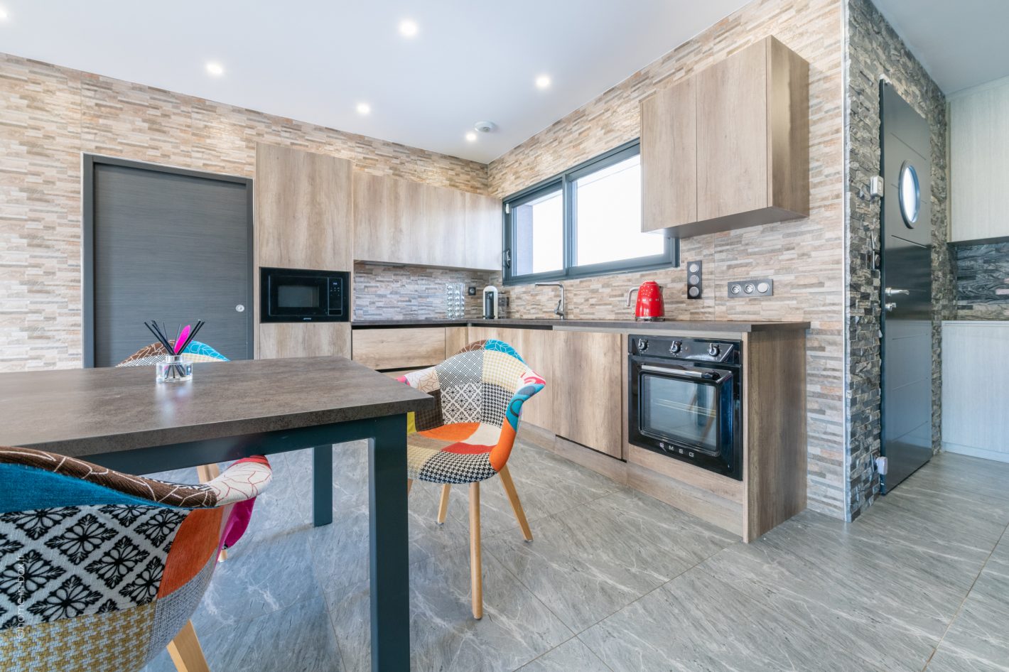 La vaste pièce de vie, ouverte sur l’extérieur, accueille une cuisine contemporaine bénéficiant d’un véritable esprit de convivialité : un espace où l’on peut cuisiner, partager, recevoir. Une arrière-cuisine vient compléter cet ensemble pour un quotidien facilité et une organisation optimale.